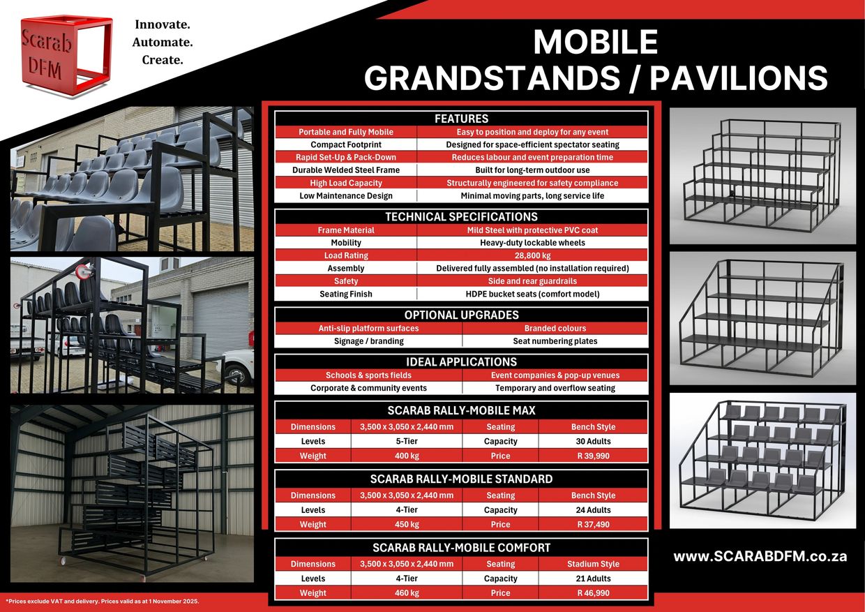 From school sports days to professional events, Scarab DFM pavilions offer comfortable, secure seating wherever the crowd gathers. Engineered for mobility and long-term durability, they are simple to move, quick to deploy, and customisable to your brand.